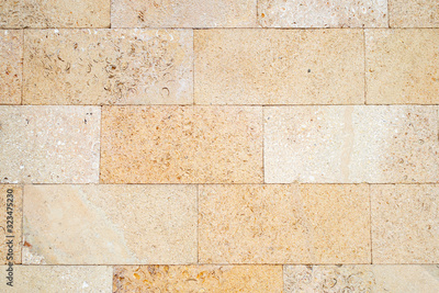 The decorated wall is made of carved pressed shell rock. Large inclusions of shells on a light yellow background for design on a building architectural theme