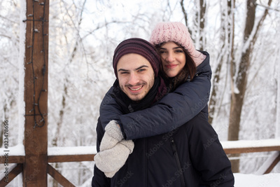 Young man and woman is having fun outdoors in winter before Christmas