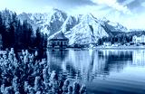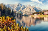 Beautiful Summer sunny landscape. Wonderful view on Misurina Alpine lake in morning. National Park Tre Cime di Lavaredo, Auronzo, Dolomites Alps, South Tyrol, Italy, Europe. Nature background