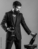 Sommelier man, degustator, winery, male winemaker. Bottle, red wine glass. Beard man, bearded, sommelier, tasting. Red wine in bottle, wineglass. Black and white