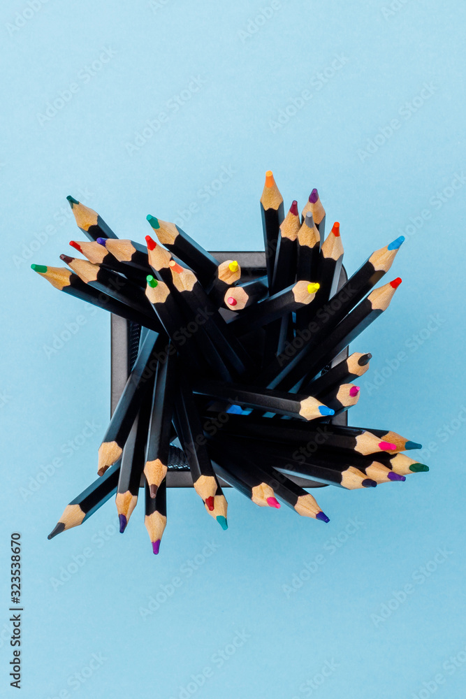 Colored pencils in a black office cup