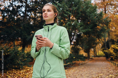 Beautiful sporty girl listening music in earphones on cellphone during run in park