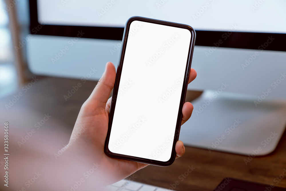Woman holding smartphone mockup of blank screen and computer on the table office. Take your screen to put on advertising.