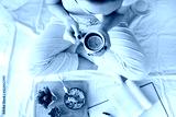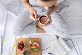 Young woman eating healthy breakfast in bed.