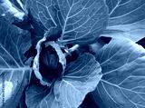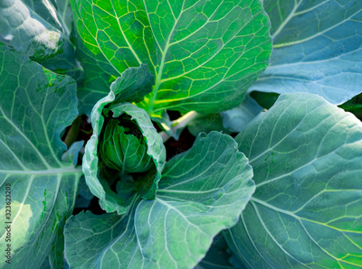 Green leaves of vegetable in garden. Leafy green vegetable. Top view of cabbage growth in farm. Organic vegetable farm. Plant cultivation. Agriculture. Rich source of natural vitamin c and vitamin k.