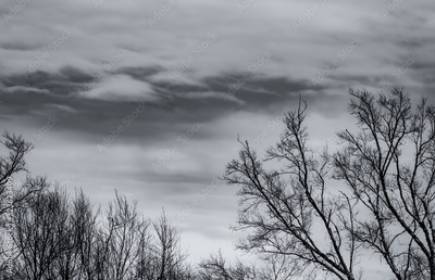 Silhouette dead tree on dark dramatic sky and white clouds background for death and peace. Halloween day background. Despair and hopeless concept. Sad of nature. Death and sad emotion background.