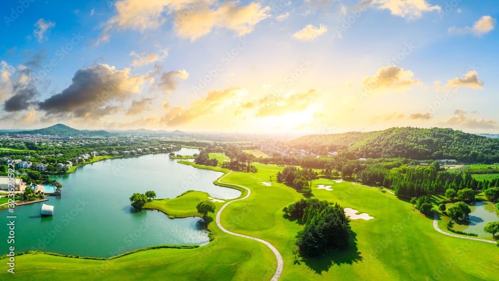 Aerial view of a beautiful green golf course in Shanghai,panoramic view.