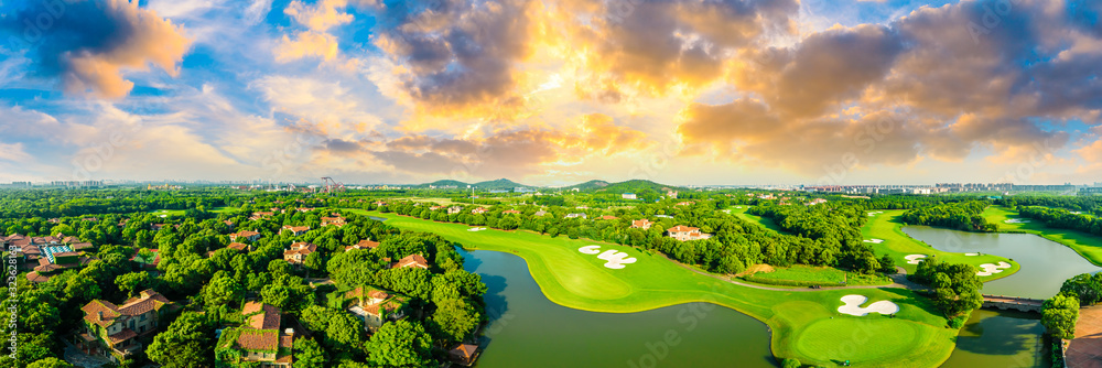 Aerial view of a beautiful green golf course in Shanghai,panoramic view.