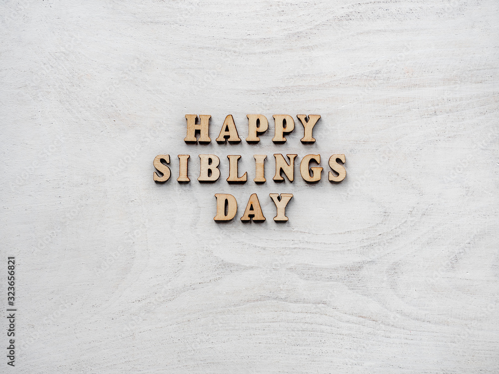 Wooden letters of the alphabet in the form of the words SIBLING DAY on the table. Beautiful card. Isolated background, wooden surface. Congratulations for relatives, friends and colleagues