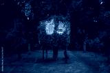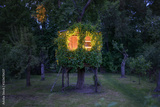 Playhouse on tree in evening summer garden glowing from the inside. Wooden treehouse, house on tree
