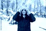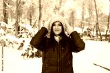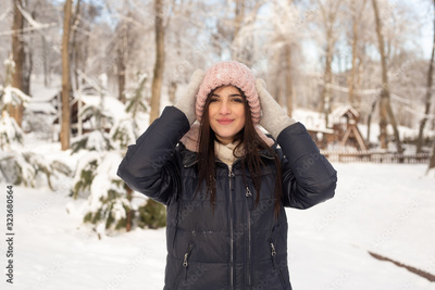 Beautiful woman standing among snowy trees in winter forest and enjoying first snow