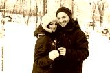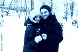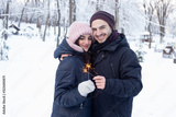 Winter love story, a beautiful stylish young couple holding sparkles in park