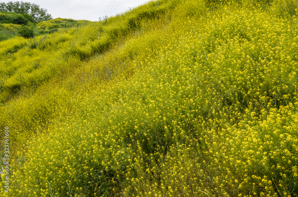 Beautiful panorama background with yellow flowers field in bloom. Nature background photo.