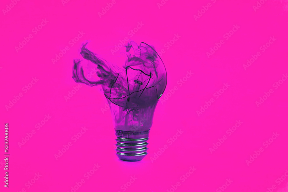 One broken light bulb on a purple background with smoke. Overdue idea concept.