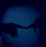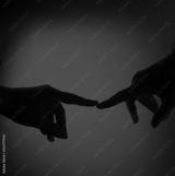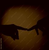 Symbol of going together, bonding or supporting, red background in black. Folded hands and interlocking fingers.