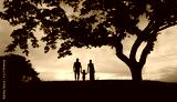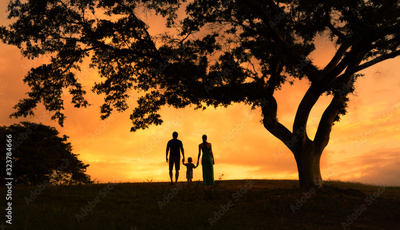 Family waking together in nature sunset holding hands.