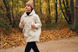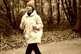 Attractive girl in down jacket dreamily running around beautiful autumn park