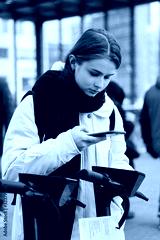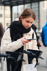 Beautiful girl thoughtfully using cellphone for renting electric scooter on street