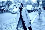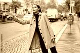 Beautiful stylish girl in trench coat thoughtfully catching taxi on street