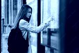 Beautiful casual girl with backpack thoughtfully looking city map on bus stop