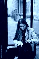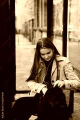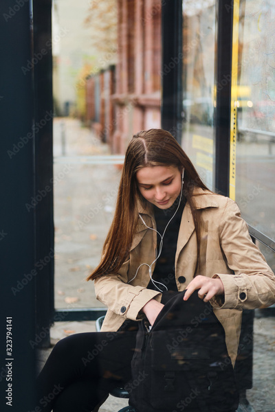 Attractive casual girl in earphones with backpack waiting public transport on bus stop