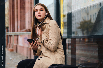 Attractive casual girl in earphones with cellphone thoughtfully waiting public transport on bus stop