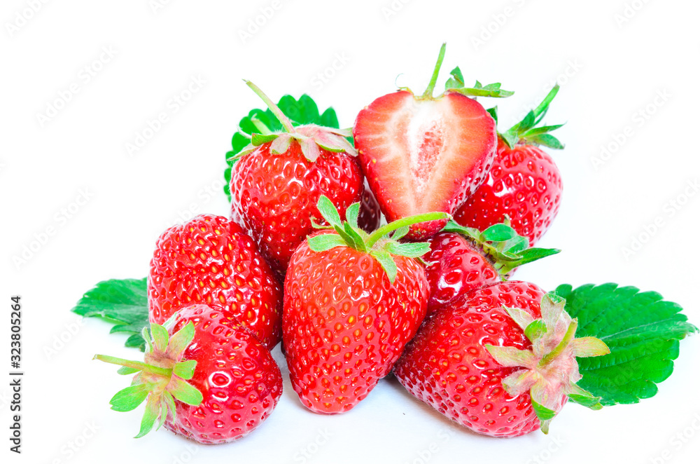 Heap of strawberries with half cut and leaves isolated on a white