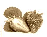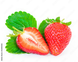 Whole and half cut strawberries and leaves isolated on a white
