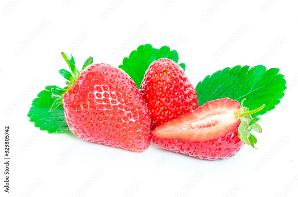 Fresh two whole strawberries with half cut and leaves isolated on a white