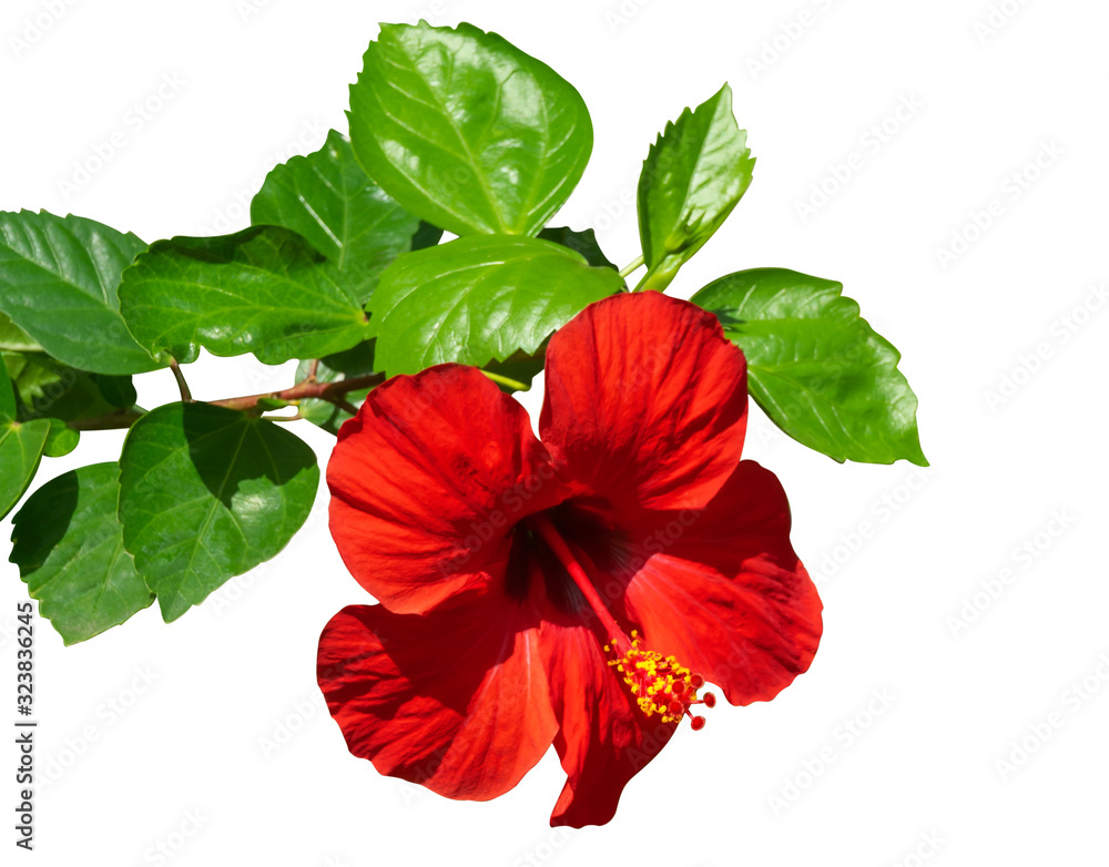 Colorful Red hibiscus flower with green leaves in exotic arrangement isolated on white with clipping path.