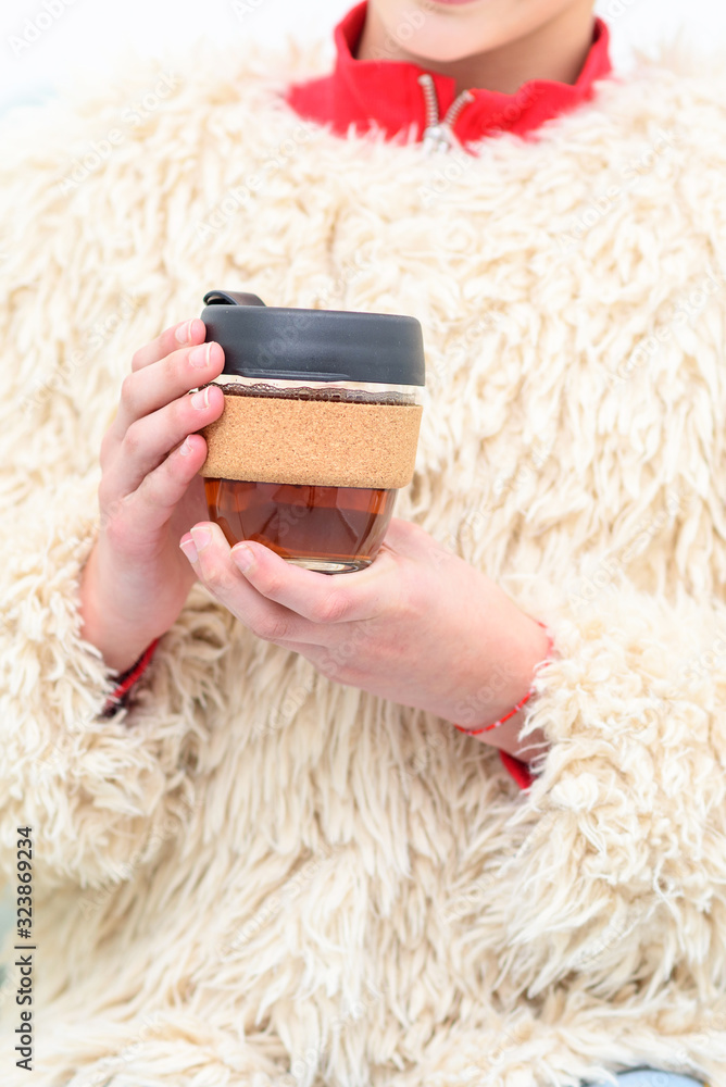 Yong woman hands hold reusable glass cup. Sustainable living. Eco friendly, zero waste concept.