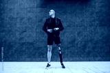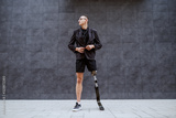 Full length of handsome Caucasian businessman with artificial leg getting tired of work and taking of his tuxedo while standing outdoors in front of gray wall. It's time for sport.