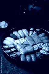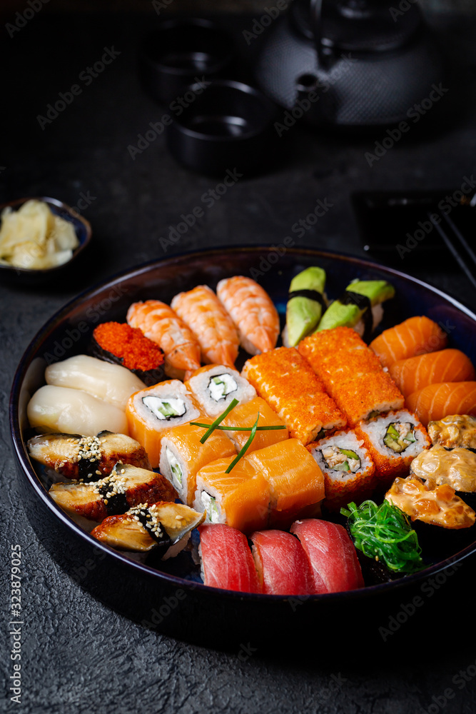 Set of sushi and maki with soy sauce over black background. Top view with copy space