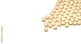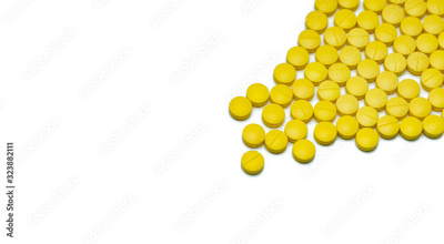 Yellow small round tablets pills on white background. Healthcare concept. Painkillers medicine. Nonsteroidal anti-inflammatory drugs (NSAIDs). Pharmaceutical industry. Painkillers or analgesic drug.