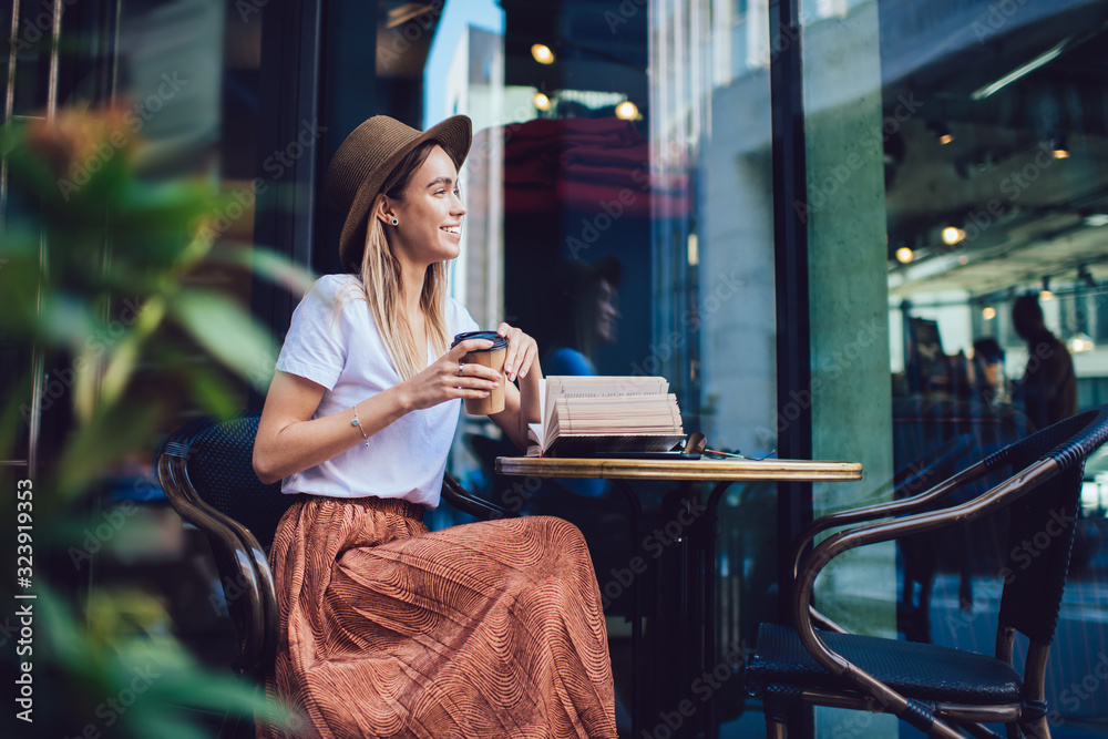 Joyful trendy woman drinking coffee while resting with book in cafe