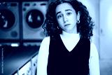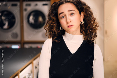 Pensive brunette girl thoughtfully looking in camera in modern self service laundry