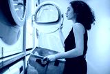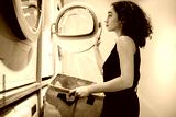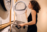 Side view of beautiful girl loading clothes into washing machine in self-service laundry