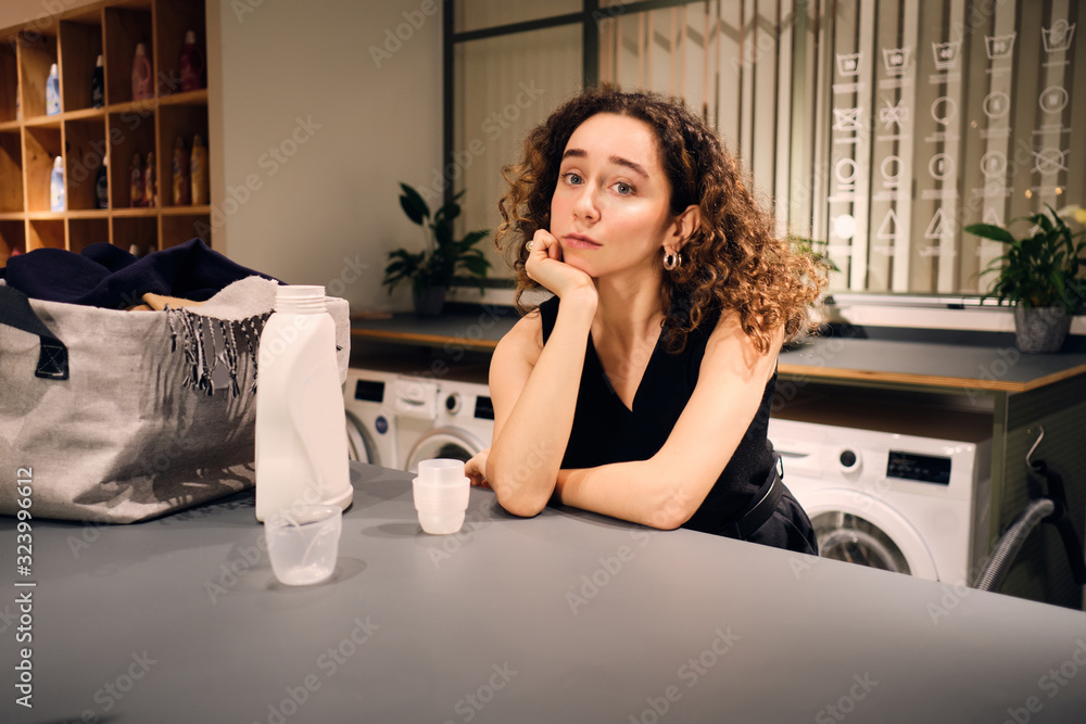Attractive brunette girl intently looking in camera waiting washing in modern self-service laundry