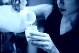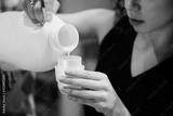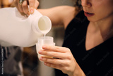 Close up girl holding detergent bottle washing clothes in modern self-service laundry