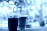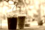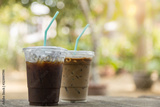 Close up of take away plastic cup of iced black coffee (Americano) and iced coffee latte on wooden table in garden with copy sapce.