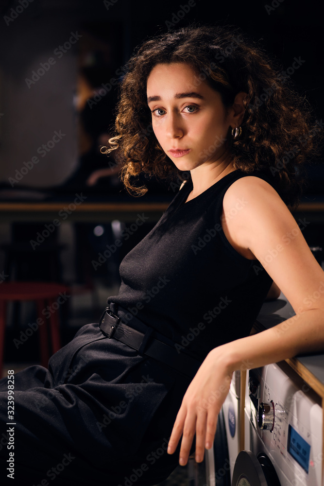 Beautiful stylish girl intently looking in camera waiting washing in modern self-service laundry at night