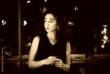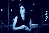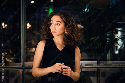 Beautiful girl thoughtfully looking away by the window in self-service laundry at night