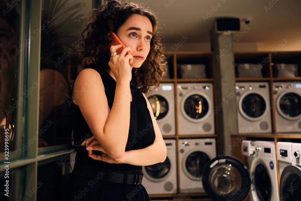 Beautiful girl talking on smartphone waiting washing in modern self-service laundry at night