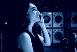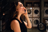 Side view of pretty girl happily talking on smartphone waiting washing in modern self-service laundry at night