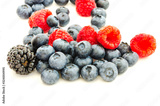 Top view close-up assortment of colorful summer berries heap isolated on white