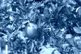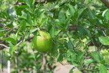 Unripe orange fruit with wind scarring on tree branches at organic farm in Houston