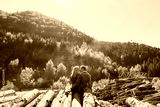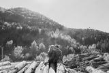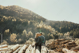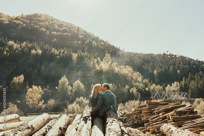 Stylish boy and girl standing on the stack of firewood in the beautiful colorful autumn forest. Back of loving couple embracing on the felled logs in the forest with perfect landscape.