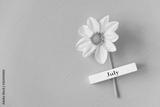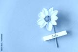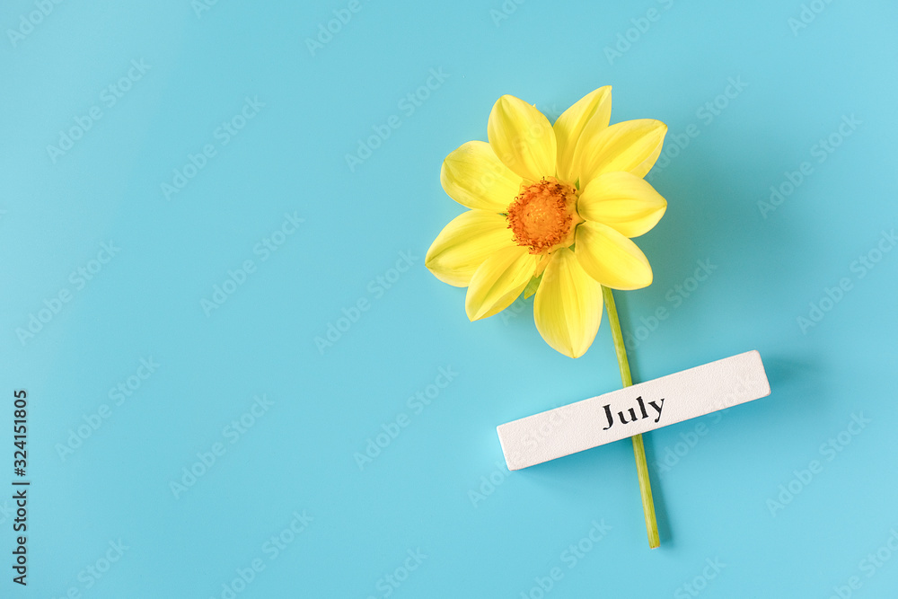 Wooden calendar summer month of July and yellow flower on blue background. Copy space. Minimal style. Template for greeting card, text, design. Hello July concept