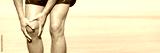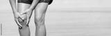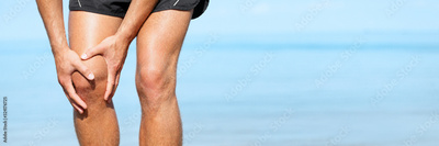 Knee pain man with painful sports injury fit runner active man athlete holding leg on outdoor summer jogging exercise panoramic banner. Fitness lifestyle.