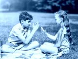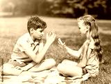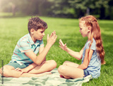 summer holidays, entertainment, childhood, leisure and people concept - group of happy pre-teen kids playing rock-paper-scissors game in park